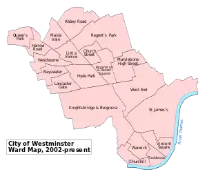 Westminster City Council, the local authority of the City of Westminster in London, England, is elected every four years. Since the last boundary changes in 2002, 60 councillors have been elected from 20 wards.[1] New boundary changes will come into effect for the 2022 elections, when the borough will be represented by 54 councillors in 18 three-member wards.[2]
