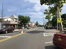 The first wave of concentrated development took place as the result of the coming of the Hackensack and New York Railroad in 1870, which followed the route of today's Pascack Valley Line. On March 5, 1870, service began between Westwood and New York City (via Jersey City and a ferry ride). Several small hotels were built near the depot, and in 1872 several houses in the latest European-influenced styles began to be built along Centre Avenue.[35] Old maps show that growth occurred simultaneously on the land both to the east and west of the tracks. The commercial buildings included lumber and coal sheds, stores, and a bakery. There was a chapel on the corner of Third and Park Avenues. The triangular park that has played an important role as a place of community gatherings is also shown on the 1876 map.[36]