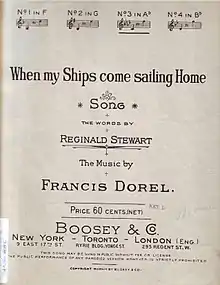 "When My Ships Come Sailing Home" is an American song composed by Francis Dorel and lyrics by Reginald Stewart. The sheet music for the song was distributed as early as 1913 by Boosey & Co, one of the forerunners of the Boosey & Hawkes publishing firm.