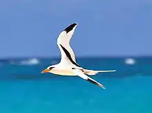 The white-tailed tropicbird (Phaethon lepturus) is a tropicbird. It is the smallest of three closely related seabirds of the tropical oceans and smallest member of the order Phaethontiformes. It is found in the tropical Atlantic, western Pacific and Indian Oceans. It also breeds on some Caribbean islands, and a few pairs have started nesting recently on Little Tobago, joining the red-billed tropicbird colony. In addition to the tropical Atlantic, it nests as far north as Bermuda, where it is locally called a "longtail".[2]