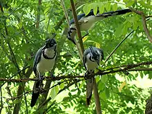 White-throated magpie-jays are omnivorous, consuming a wide range of animal and plant matter. Items included in the diet include invertebrates such as insects and caterpillars, frogs, lizards, eggs and nestlings of other birds, seeds, fruits, grain, and nectar from Balsa blossoms.[6] Younger birds take several years to acquire the full range of foraging skills of their parents.[7]