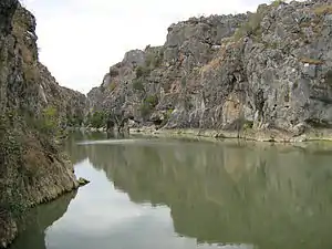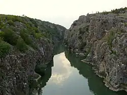 The White Drin Canyon or White Drin Gorge (Albanian: Gryka e Drinit të Bardhë; Serbian: Kanjon Belog Drima, Кањон Белог Дрима) is a small canyon located in the southwestern Kosovo. The White Drin river runs through the canyon. The canyon is relatively short, only being about 900 m (1 mi) long with a depth of 45 meters. At the entrance of the canyon is Fshajt Bridge, an old Ottoman bridge which attracts divers from all over the Balkans. Canyon of the White Drin river at Fshajt Bridge due to its hydrological and geomorphological values, in 1986 was taken under legal protection as a Natural Monument.[1]