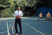Basketball lines were drawn and baskets added so it could be used as a basketball court during the presidency of Barack Obama in 2009.[1] Obama celebrated his 50th birthday with a game of basketball on the court organized by his friends and his aide Reggie Love.[11] The game featured the NBA and WNBA players Shane Battier, LeBron James, Magic Johnson, Maya Moore, Alonzo Mourning, Joakim Noah, Chris Paul and Derrick Rose in addition to Obama's friends from high school.[11] Kobe Bryant and Bill Russell were spectators.[11]
