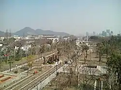 Zhakou Railway Station (simplified Chinese: 闸口站; traditional Chinese: 閘口站) within the park was the south terminal station of the Jianggan-Gongshu Railway.[21][22] The station was opened on 23 August with the launch of the railway.[23] The Jianggan-Gongshu Railway, or shortly the Jiangshu Railway, was the first railway in Zhejiang. The railway between Genshanmen and Zhakou later became part of the Shanghai-Hangzhou Railway in August 1909.[24] During the Down to the Countryside Movement in 1960s and 1970s, Zhakou was the station of departure of tens of thousands of sent-down youths.[15] From 23 December 1968 to 25 October 1970, these sent-down youths were sent to Heilongjiang via 25 trains, of which all but the first three trains departed at Zhakou.[23]