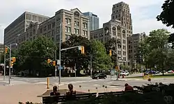 The Whitney Block is a Government of Ontario office building located in Toronto, Ontario, Canada. It is located across the street from the Ontario Legislative Building, and contains the offices of the Premier of Ontario and most cabinet ministers. The street address of Whitney Block is 99 Wellesley Street West, though the principal facade faces west towards Queen's Park Crescent and the Ontario Legislature. The building is linked to the legislature by a tunnel under the street, by a bridge to the Macdonald Block, and through there via another tunnel to the subway. The Modern Gothic-Art Deco structure was built in 1926 by architect F. R. Heakes and the tower was added in 1932. Whitney Block is faced with Queenston limestone. The facade is ornamented by repeated sequences of quatrefoils, and figures designed by Charles Adamson, which represent abstract ideals like justice, tolerance, wisdom and power, as well as more ordinary pursuits such a mining, forestry, labour, law, education and farming.[1] The floors are made of marble mined in Bancroft.[2]