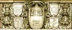 Above the door, hallmarks of 15th-century printers: Caxton; Rembolt; Aldus; Fust and Schöffer.[49]