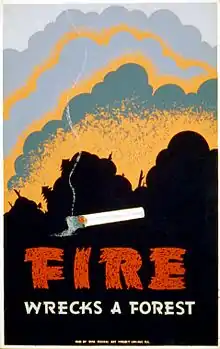 Since the turn of the 20th century, various federal and state agencies have been involved in wildland fire management in one form or another. In the early 20th century, for example, the federal government, through the U.S. Army and the U.S. Forest Service, solicited fire suppression as a primary goal of managing the nation's forests. At this time in history fire was viewed as a threat to timber, an economically important natural resource. As such, the decision was made to devote public funds to fire suppression and fire prevention efforts. For example, the Forest Fire Emergency Fund Act of 1908 permitted deficit spending in the case of emergency fire situations.[4] As a result, the U.S. Forest Service was able to acquire a deficit of over $1 million in 1910 due to emergency fire suppression efforts.[4] Following the same tone of timber resource protection, the U.S. Forest Service adopted the "10 AM Policy" in 1935.[4] Through this policy, the agency advocated the control of all fires by 10 o'clock of the morning following the discovery of a wildfire. Fire prevention was also heavily advocated through public education campaigns such as Smokey Bear. Through these and similar public education campaigns the general public was, in a sense, trained to perceive all wildfire as a threat to civilized society and natural resources. The negative sentiment towards wildland fire prevailed and helped to shape wildland fire management objectives throughout most of the 20th century.
