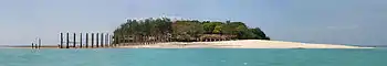 Chapwani Island, 600 by 60 metres (1,970 ft × 200 ft) in size, is under private ownership, and has white sand beaches on one side, surrounded by lush vegetation and many coral inlets with swimming pools on the other side. The island boasts more of history than wildlife. Fauna seen is mostly dik dik antelopes. It is 3 kilometres (2 mi) north of Stone Town.[30] It was formerly known as the French Island. It is also called as the Grave Island, named after the small naval cemetery and the tombs of colonial-era British seamen at its southern end, dated to 1879. The cemetery was specially built in 1879 by Sultan Barghash for the burial of English people of the Royal and Merchant Navies. British sailors killed during the battle between HMS Pegasus and the German cruiser Koningsberg in 1914 are buried here. It is about 4 kilometres (2 mi) north of Zanzibar Town. Potable water is supplied from Zanzibar. As it is privately owned, stay on the island is allowed by booking rooms on the only lodge on the island or on a day visit only by buying a meal ticket.[9][31][32]