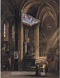 Shortly after, a local priest who had heard of his talent hired him to paint images at the church in Kozly, which resulted in further commissions, generally done in conjunction with older artists, including panoramic views of Prague and commemorative drawings for the coronation of Ferdinand as King of Bohemia in 1836. This allowed him to continue his studies and, after his father's death in 1837, be sole support for his family.[1] His career painting frescoes began when Eduard Gurk, the Habsburg's court painter, arranged for him and Antonín Lhota to paint the staircase of the grand tower at Karlštejn Castle. He was then selected for further training in fresco work by Johann Baptist Müller (1809–1869) and Josef Holzmaier.