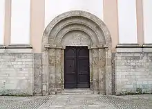 Nothing remains of the original castle of Wilhering nor of any buildings erected by the monks of Rein. The monks of Ebrach, however, started the construction of a church in 1195 in the Romanesque style, repeatedly rebuilt in the following centuries. Of the previous buildings, only a Romanesque doorway, parts of the Gothic cloister and two tombs Gothic Schaunberg family tombs located on either side of the entrance by the western wall of the abbey church remain. The plain round-arched Romanesque portal of the former 12th-century church was integrated into the present Rococo church.