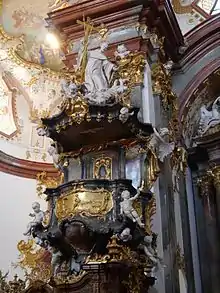 According to the German art historian Cornelius Gurlitt, "the abbey church of Wilhering is the most brilliant achievement of the Rococo style in the German-speaking world."[5] It gives the impression that more decoration, colour, sculptures, paintings and stuccowork could not be found in a single place. The Baroque dream that heavenly light-heartedness and timeless happiness can be brought down to earth, a dream which in the Rococo period reached its nearly unrestrained climax, has come true at Wilhering.[6] Moreover, all the individual elements are in harmony and seem to be connected in some way: the altars, the pulpit, the two organs, the choir stalls, the putti and the frescoes with numerous saints, with clouds and blue sky. These artists had a uniform feeling for style and taste.
