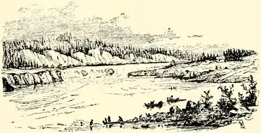 European fur traders became aware of the falls in 1810. John McLoughlin established a land claim at the falls in the name of the Hudson's Bay Company in 1829.[7] Oregon City was established in 1842 near the east end of the falls. The town of Linn City was founded on the western shore one year later in 1843. The two towns competed economically, vying for the lucrative steamboat traffic and the trade it generated. With the falls representing the end of the line for boat traffic, river boat captains were forced to choose a side of the river on which they would dock to unload their passengers and goods; some of which would continue their upriver journey on winding portage toll roads. Competition between the towns was fierce until the Great Flood of 1862. Oregon City was inundated and badly damaged, while Linn City was obliterated.