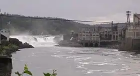 The Willamette Falls is a natural waterfall on the Willamette River between Oregon City and West Linn, Oregon, in the United States. It is the largest waterfall in the Northwestern United States by volume, and the seventeenth widest in the world.[1] Horseshoe in shape, it is 1,500 feet (460 m) wide and 40 feet (12 m) high with a flow of 30,849 cu ft/s (874 m³/s), located 26 miles (42 km) upriver from the Willamette's mouth. Willamette Falls is a culturally significant site for many tribal communities in the region.