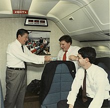 In preparation for major visits abroad and in the Oval office, as well as visits outside the United States, Martin would sometimes do the first draft of the President's weekly radio address in close coordination with Presidential chief speech writer Ben Elliott. Three of these addresses were especially important. First, Reagan's radio address in 1984 following his first meeting with a Soviet leader (Foreign Minister Gromyko) after four years in office.[14] This widely quoted radio address, highlighted in headlines on the front page of the Washington Post set the agenda and tone for the subsequent meeting with Soviet leader Gorbachev one year later. Reagan recognized Martin's role in its drafting in the following letter.[2] Second, Martin prepared a radio address describing the G-7 Economic Meeting chaired by Margaret Thatcher in 1984.[2] And third, he prepared a radio address in 1983 describing the President's visit to Japan and Korea.[2]