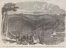 Drawing of the Cinchona plantations from Illustrated London News 6 December 1862. Sir William Denison sits with W.G. McIvor to his left (with a spade in his left hand and hat in right).
