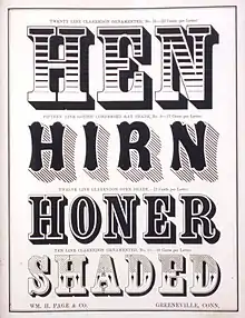 Page was a prolific designer of typefaces, all of them typical of the heavily ornamented style of the mid-nineteenth century. The following types were designed by Page:[2]