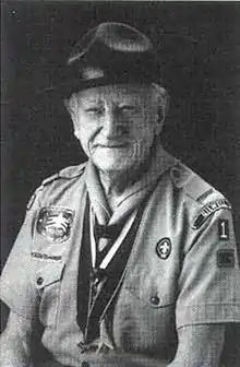 William Hillcourt (August 6, 1900– November 9, 1992), known within the Scouting movement as "Green Bar Bill", was an influential leader in the Boy Scouts of America (BSA) organization from 1927 to 1992.[1] Hillcourt was a prolific writer and teacher in the areas of woodcraft, troop and patrol structure, and training; his written works include three editions of the BSA's official Boy Scout Handbook, with over 12.6 million copies printed, other Scouting-related books and numerous magazine articles. Hillcourt developed and promoted the American adaptation of the Wood Badge adult Scout leader training program.