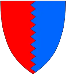 Arms of William V de Braose (d.1230), as drawn by Matthew Paris (c.1200-1259) in his Historia Anglorum (folio 116): Party per pale indented gules and azure[5]