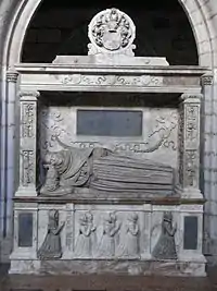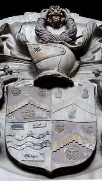 He died on 9 October 1604, in the year of his seventieth birthday, at his house at Little Fulford (renamed Shobroke Park in the early 1800s, demolished)[15] east of Crediton in Devon. His monument exists in Crediton parish church to the north of the chancel, showing a life-like effigy of his recumbent figure his head propped up on his hand. He had served at the Exchequer for eleven years and nine months, and his funeral and burial in Crediton Church appears to have been a significant event, as it was well attended, according to Prince not only by "The gentry, clergy, and others in these parts, but also with heralds at arms, marshalling all according to their rank and place".[3]