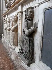 3 wives & 4 daughters of Sir William Peryam, detail from base of his monument in Crediton Church. In the foreground is his 3rd wife Elizabeth Bacon