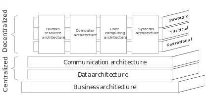 - "... data architecture and communication architecture are shown as horizontal bars because these are corporate-wide information resource components. They serve all business units. The four vertical resource components are business specific. The resources can be divided according to the business units they serve. That us, data and communication might be centralizes resources, whereas human resources (professional systems staffs), computers, user-computing, and systems could all be decentralized resources to one degree or another."[9]