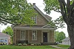 The 1½-story structure is composed of locally quarried limestone. It features chamfered rustication, two octagon-shaped stone chimneys, cut out bargeboards with a pendant post at the gable peak, and a full-length Greek Revival-style front porch (a later addition). The rear frame addition and porch was built in either the late 19th century, or the early 20th century. The roof dormers are early 20th century additions. The house was listed on the National Register of Historic Places in 1993.[1]