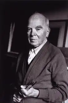 In 1958 Roberts was elected an Associate of the Royal Academy, and two years later, when he turned 65, he retired from his one-day-a-week teaching position at the Central School. However, his output as an artist over the next fifteen years remained prolific. In 1961 he was given an award by the Calouste Gulbenkian Foundation "in recognition of his artistic achievement and his outstanding service to British painting".[47] In that same year he began painting The Vorticists at the Restaurant de la Tour Eiffel, Spring 1915 (completed 1962; now in the Tate Gallery), a nostalgic recollection of a boisterous Vorticist gathering in 1915 that can be read as an attempt by Roberts to build bridges following the "Vortex Pamphlets" debacle. A major retrospective of his work, organised by the Arts Council of Great Britain and curated by Ronald Alley, opened at the Tate Gallery in 1965, and a smaller version was also shown in Newcastle and Manchester. In the same year Roberts was offered, but rejected, an OBE.[48] He was, however, pleased to be elected a full member of the Royal Academy in 1966.[49] While still tackling a variety of subjects, Roberts became somewhat obsessed with the self-portrait, and a number of his self-portraits would be exhibited by the National Portrait Gallery in 1984.[50]