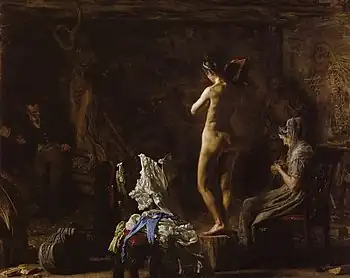 Eakins's interest in William Rush originated from a desire to restore Rush's name to prominence in the history of American art. Eakins taught at the Pennsylvania Academy of the Fine Arts, of which Rush had been a founder. Eakins was a strong believer in teaching human anatomy, and insisted that his students study from nude models. Since it is unlikely that Rush had employed a nude model for his sculpture of a draped water nymph,[4] the painting may be viewed as Eakins's demonstration of the importance of studying anatomy from nudes.