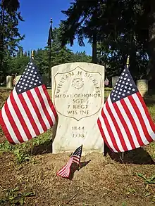 Sickles died on September 26, 1938, at the Washington Soldiers Home in Orting and is buried there in Washington Soldiers Home Cemetery, near his comrade and fellow MOH recipient Albert O'Connor.[3] He was the last surviving MOH recipient of the American Civil War. [4]