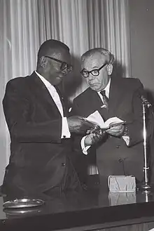 In foreign policy, Tubman aligned his country with the US, which he hailed as "Our strongest, closest, and most reliable friend."[15] In June 1944, he and former president, Edwin Barclay, traveled to the White House as guests of President Franklin D. Roosevelt, and became the first African heads of state to be received there.[3] Following the war, which resulted in an anti-colonial movement on the African continent, Tubman strengthened ties among fellow Africans by participating in the Asian-African Conference of 1955, and the First Conference of Independent African States in Accra, organized in 1958 by Kwame Nkrumah of Ghana.[16] In 1959, Tubman organized the Second Conference of African States.[17][18]