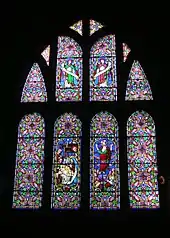 Wailes' design divides the window's main part into four rather than three stages, each containing three complex narrative scenes which are made successfully to span three lights. The central section which shows the Nativity of Christ with the Baptism of Christ in the Jordan by John the Baptist (one below the other) is a particularly successful composition, considering that it contains two significant narrative incidents which visually harmonise, yet remain discrete scenes. While each of the twelve individual pictures works as a unit, the visual composition of the whole window is skilfully arranged so as to present as an integrated work of art. This has been achieved by the skilled placement of the 116 figures and the equally skilful disposition of colour.