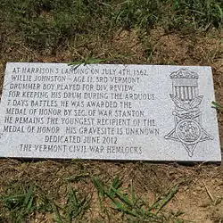 "At Harrison's Landing on July 4, 1862, Willie Johnston—age 11, 3rd Vermont Drummer Boy played for Div. review. For keeping his drum during the arduous 7 days battles, he was awarded the Medal of Honor by Sec. of War Stanton. He remains the youngest recipient of the Medal of Honor. His gravesite is unknown. Dedicated June 2012. The Vermont Civil War Hemlocks."[51]