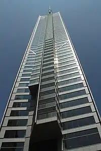 Wilshire Grand Center is a 1,100-foot (335.3 m) skyscraper in the financial district of downtown Los Angeles, California, occupying the entire city block between Wilshire Boulevard and 7th, Figueroa, and Francisco streets. Completed in 2017, it is the tallest building west of Chicago. Though the structural top (in this case, the spire) of the Wilshire Grand surpasses L.A.'s U.S. Bank Tower by 82 ft (25 m), the roof of the U.S. Bank Tower is still 90 ft (27.4 m) above the Wilshire Grand's.[8] The Skyscraper Center lists the Wilshire Grand Center as the 15th-tallest building in the U.S. and the 95th-tallest in the world. It won the Structural Engineering Award 2019 Award of Excellence from the Council on Tall Buildings and Urban Habitat.[9]