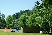Athletic facilities at the park include several fields and courts.[1] Courts include one full-sized basketball court, a half-sized basketball court, two tennis courts, and a beach volleyball court.[1] The fields include one baseball field, four softball fields, and three soccer fields that overlay the softball diamonds' outfields.[1] Memorial Park also includes the only skatepark in the city.[1]