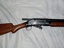 The Winchester Model 1897 and the Winchester Model 1893 were both designed by John Browning. The Model 1897 is an external hammer shotgun that is lacking a trigger disconnector. This means that the user can hold the trigger down while cycling the shotgun and once the action is returned to battery the shotgun fires.[10] The firearm itself is classified as a slide action pump shotgun. It was the first truly successful pump-action shotgun produced. Throughout the time period the Model 1897 was in production, over a million of the type were produced in various grades and barrel lengths. 16-gauge guns had a standard barrel length of 28 in (71 cm), while 12-gauge guns were furnished with 30 in (76 cm) length barrels. Special length barrels could be ordered in lengths as short as 20 in (51 cm), and as long as 36 in (91 cm). Along with various grades and barrel lengths, the Model 1897 came in two different chamberings. One was the 12 gauge and the other was the 16 gauge.[10] The shells should be of the 2+58 inch or 2+34 inch models.[5] Any shells larger are not recommended. An average Model 1897 can hold 5 or 6 shotgun shells in the magazine tube.[11] When working the action of the Model 1897 the forend (fore grip) is pulled back, forcing the breech bolt to the rear which extracts and then ejects the spent shell while simultaneously cocking the external hammer by pushing it to the rear. When the forend is slid forward again, the breech bolt pushes a fresh shell into the gun's chamber and locks into place.