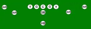 Also known simply as "Five-wide", a reference to the five wide receivers. In the empty backfield formation, all of the backs play near the line of scrimmage to act as extra wide receivers or tight ends, with the quarterback lining up either under center or, most commonly, in the shotgun. This is almost exclusively a passing formation used to spread the field, often to open up short inside routes or screen routes. The most common running play from this formation is a quarterback draw play up the middle since defensive players are spread out from sideline to sideline. It can also be used similarly to a flexbone formation, with the receivers closest to the center acting as wing backs in an option play. This formation is most often used on obvious passing downs in the NFL and college football though some teams use it more often, such as Texas Tech University and the New England Patriots in their record-setting 2007 season.