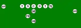 One variation of the T Formation would be where all the running backs would be closer than usual, being at fullback depth rather than halfback depth. Another variation of the "balanced T" formation is the so-called "unbalanced T" formation.[2] In this configuration the line of scrimmage has an end and tackle left of center, while to the right of the center are two guards, a tackle, and an end. This creates a line that is weighted toward the right of the center. With the backfield lining up in the conventional T formation behind the center (quarterback, two halfbacks and fullback), the resulting configuration is "unbalanced" due to the asymmetry of the placement of the linemen. The "split T" spreads the offensive line out over almost twice as much ground compared to the conventional T formation. This causes the defensive line to also spread out, creating gaps the offense can exploit.[3]
