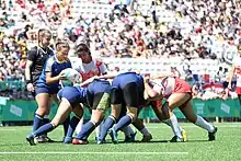 In Sydney in 1921, two women's teams played a game of rugby league in front a crowd of 30,000[12]—a photograph appeared in The Times in 1922—but pressure from authorities ensured that they did not play again. Throughout the 1920s a popular form of women's football game very similar to rugby called "barette" was played across France. The game had only minor differences to the full game (games were 10-a-side and had some minor restrictions on tackling) and there were national championships throughout the decade. It received support from several male rugby players and film also exists of a game being played in 1928.[13] Both barette and the full game of rugby featured in several newspaper cartoons[14][15] and many photographs exist.[16] For reasons unknown the game appears to fade away in the 1930s.