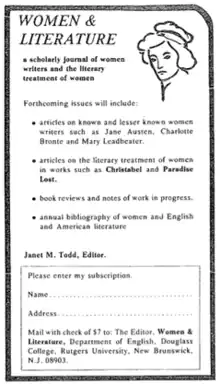 Women & Literature was an American feminist scholarly journal. Janet Margaret Todd, a British academic and author, founded the journal around the 1970s while she was teaching at Rutgers University.[1] Women & Literature wrote about feminist film and literature and sought to support the feminist work of the 1970s.[2] It advertised itself as “a scholarly journal of women writers and the literary treatment of women”.[3] Issues included articles on women writers such as Jane Austen, Charlotte Bronte, and Mary Leadbeater.