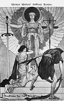 The Women Writers' Suffrage League (WWSL) was an organisation in the United Kingdom formed in 1908 by Cicely Hamilton and Bessie Hatton.[1] The organisation stated that it wanted "to obtain the Parliamentary Franchise for women on the same terms as it is, or may be, granted to men. Its methods are the methods proper to writers – the use of the pen."[2] The organisation viewed itself as a writers' group rather than a literary society.[3] Membership was not based on literary merit, but instead was granted to anyone who had published and sold a written work.[3] Members also paid an annual subscription fee of 2s. 6d.[4] The league was inclusive and welcomed writers of all genders, classes, genres, and political persuasions provided they were pro-suffrage.[3] By 1911 the league was composed of conservatives, liberals and socialists, women of power and women who worked hard and members of the military.[5] The league disbanded on 24 January 1919[3] following the passing Representation of the People Bill in February 1918, granting women over the age of 30 the right to vote.[6]