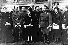 Nationalist supporting women behind Nationalist lines also sometimes were involved in auxiliary roles. This included working as nurses, provisioners and support personnel.[33][32] They were encouraged to do so by men as a means of supporting the traditional Spanish family structure.[32]