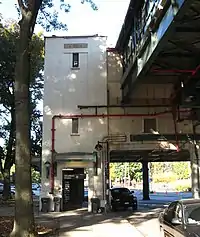 Between the towers is a two-story span. Its lower level, the mezzanine, is faced in concrete and divided into three sections divided by square pilasters. All have a recessed triple casement window; that in the central portion is flanked by two similar double windows. Traffic lights are mounted on the west side and western portion of the central section below window level. At the top of each pilaster is a mosaic tile. A smooth metal strip runs across the top. Above it is an apparent second story, sided in the vertical plywood that shelters the platform. It is recessed slightly from the mezzanine, with its fenestration echoing that below.[6]