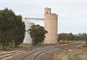 ![]() Looking south, grain silos and loop siding, with stabled track machines | ||||||||||||||||