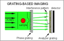 Grating-based imaging (GBI) includes Shearing interferometry or X-ray Talbot interferometry (XTI), and polychromatic far-field interferometry (PFI).[38] Since the first X-ray grating interferometer—consisting of two phase gratings and an analyzer crystal[25]—was built, various slightly different setups for this method have been developed; in the following the focus lies on the nowadays standard method consisting of a phase grating and an analyzer grating.[26] (See figure to the right).