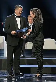 Polish President Bronisław Komorowski awarding the first prize to Yulianna Avdeeva