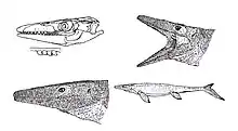 Reconstruction of Xenodens skull with the teeth (upper left) and its life appearance
