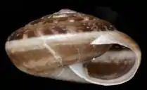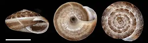 Shape convex to low-convex above, flattened below. Whorls rounded, with shallow to very shallow sutures. Umbilicus moderately wide, symmetrical, deep, exposing upper whorls, usually slightly overlapped by reflected peristome. Mouth broadly oval, except where interrupted by penultimate whorl; last part of body whorl expanding, descending near mouth. Shell moderately thick, slightly translucent; surface glossy above and often strongly glossy below. Ground-colour pale brown throughout, or whitish beneath; upperside nearly always with brown to blackish-brown markings that are very variable in extent, but form sharply defined bands on only a minority of shells, consisting instead of interrupted bands or rows of irregular blotches, often with whitish rib crests; underside also with very variable dark markings, often in several thin interrupted bands; underside some- times mainly dark brown. Transverse ribs on upperside of shell ± regular on higher whorls of spire, becoming weak or partly absent on body whorl; on underside generally weaker.[3]