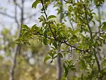 Flowering is commonly observed during dry seasons.[7] The flowers are fragrant, small, coloured white, yellow-green or pink and are about 5 to 10 mm (0.2 to 0.4 in) long. They grow on branched inflorescences, which are either pedunculate racemose or umbelliform cymes, that are on pedicles 3-7mm long. Fruits are shaped globose, subglobose, drupaceous or ellipisoid, grow up to 3 cm long, have a diameter of 2.5 cm and are smooth.[9][7][10]