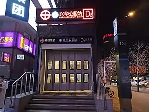 Xinghuagongyuan (Chinese: 兴华公园站; pinyin: Xìnghuágōngyuán Zhàn) is a station on Line 9 of the Shenyang Metro.[1] The station opened on 25 May 2019.[2]