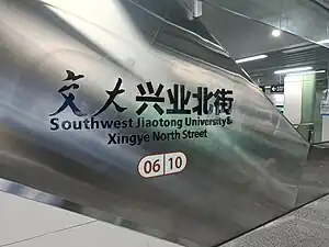 Southwest Jiaotong University & Xingye North Street Station is a metro station at Chengdu, Sichuan, China. It is opened on December 18, 2020, with the opening of Chengdu Metro Line 6.[1][2][3]